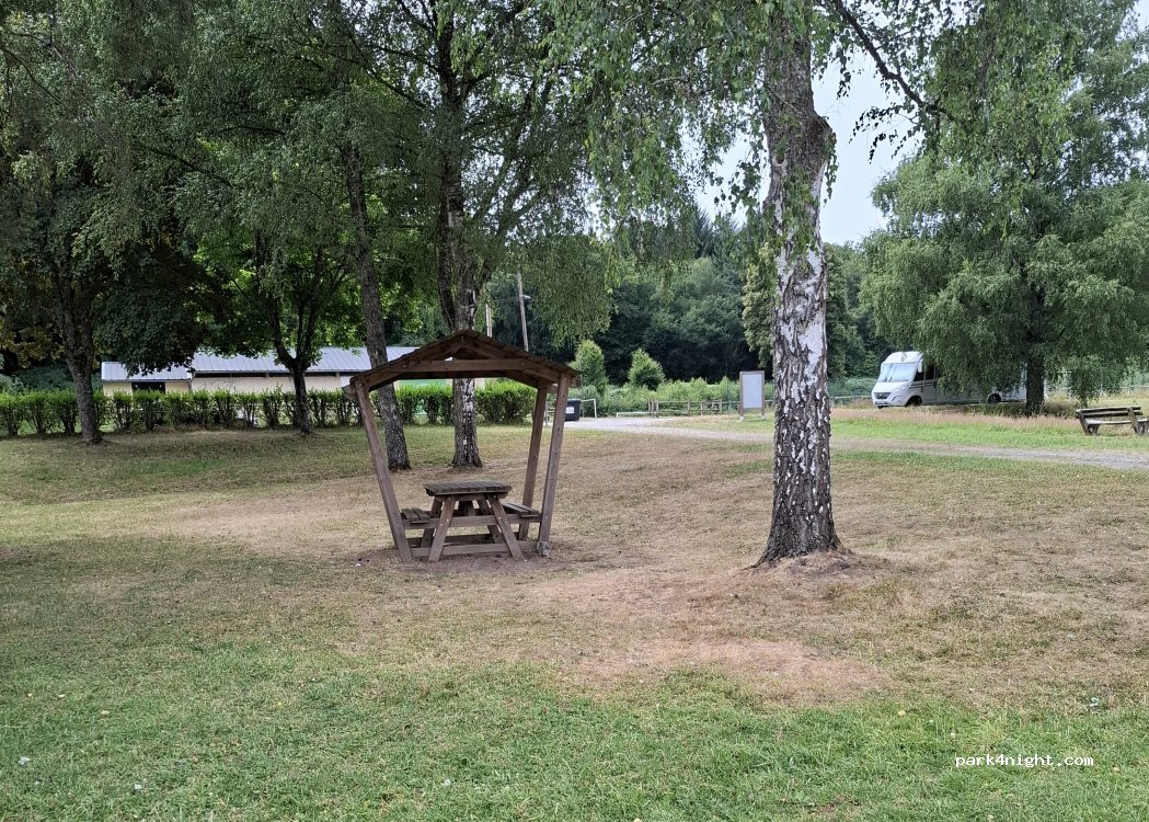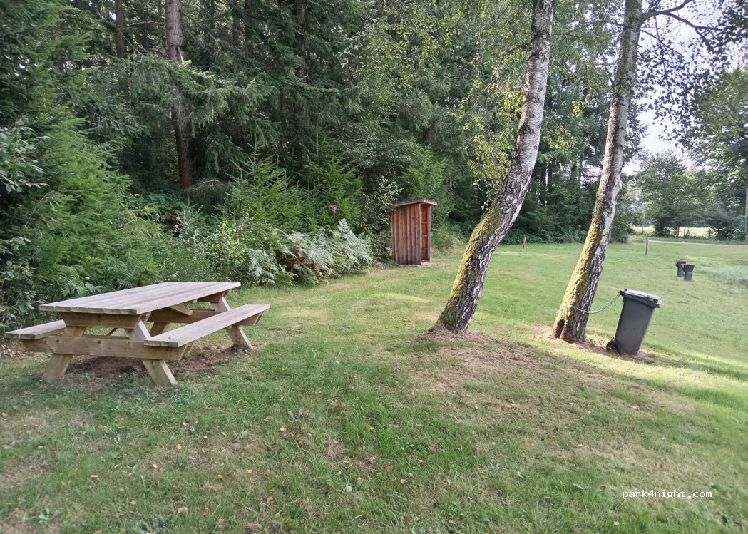 nous avons passé une nuit sur un terrain plat stabilisé. table de pic nic et jeu pour enfant. très calme dans la nuit et sur le matin un peu plus de passage. joli cadre avec l étang