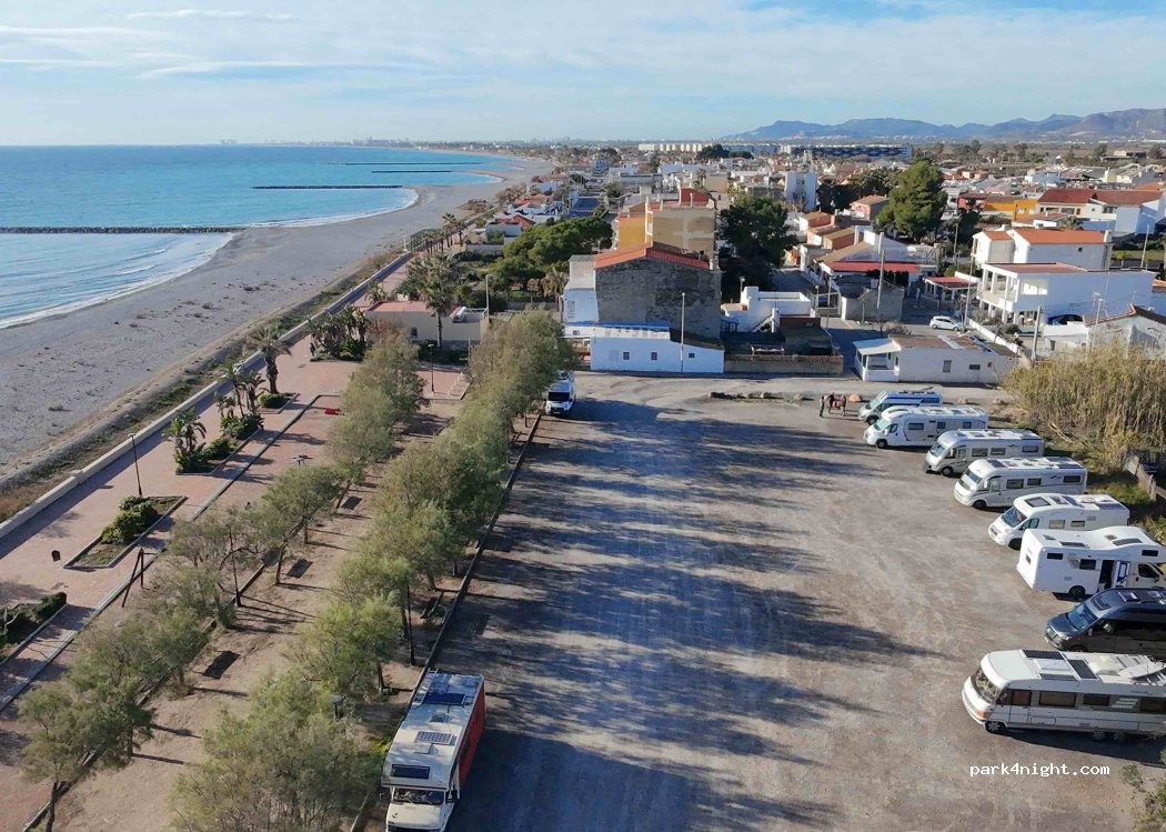 Buen sitio para pernoctar al lado de la playa y sitio para unas 15 acs. Ideal para caminar o ir en bici al lado del mar hacia sagunto o Moncófar. Tienda y fuente cerca. Para los aficionados a la ornitología a pocos minutos se encuentra el paraje de los estanys de Almenara con bastantes aves.