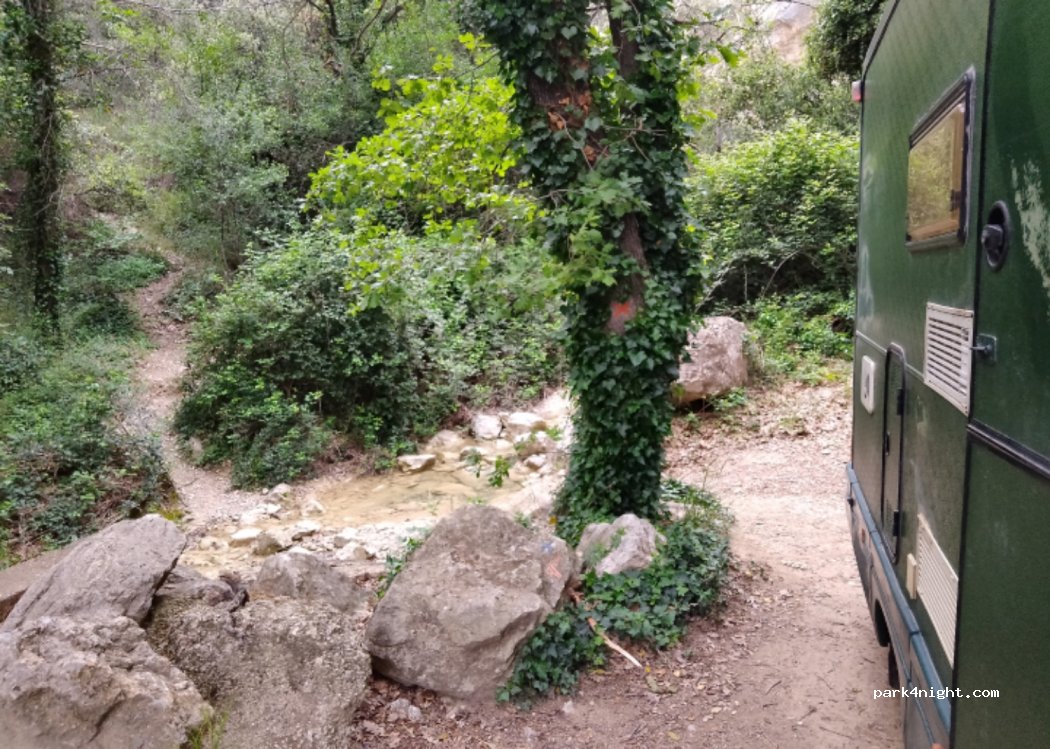 In the direction of the Dentelles de Montmirail, a small shaded corner by a river and by the road. 10mn walk, waterfalls. On the circuit of the Tour des Dentelles de Montmirail. Place tested during the week, very quiet. Garbage cans nearby.