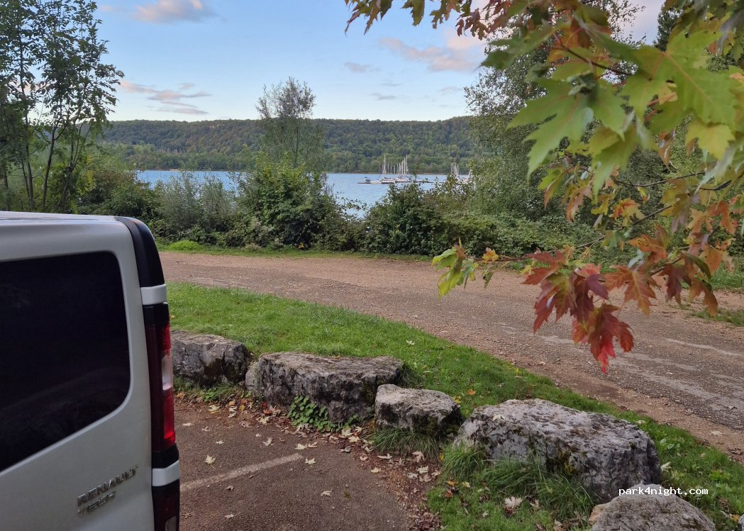 Spot au top vue sur le lac. Parking gratuit et accès direct sur la plage (chiens autorisés). Accès pour les vans car hauteur max 2,1m. La nuit a été calme.