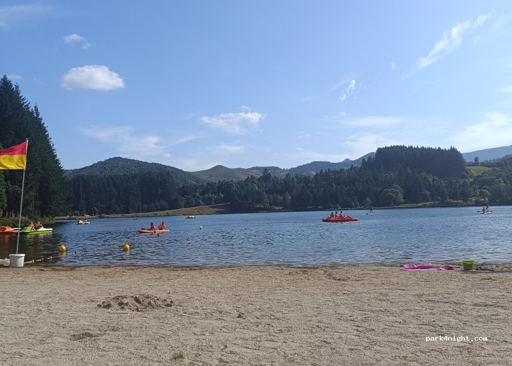 Aire payante au-dessus du lac, juste à côté du camping. coin restauration type snack-bar du camping qui fait dépôt de pain et viennoiseries (sur commande) à partir de 8h. Toboggan, aire de volley, foot, basket, balançoire. Sur le lac nous avons pédalo et paddle et possibilité de se baigner avec une zone surveillée de 13h à 18h. Barbecue public. À visiter