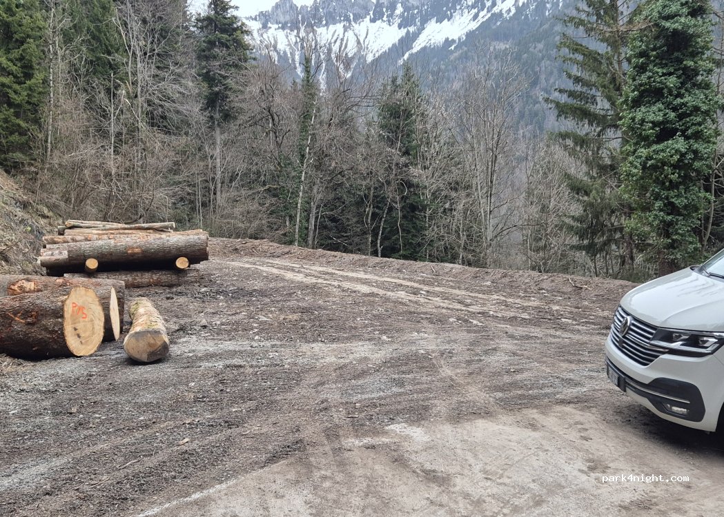 Ruhiger Ort an einer Strassenkurve mitten im Wald, unspektakulär, plane Fläche, für eine Übernachtung gut geeignet.