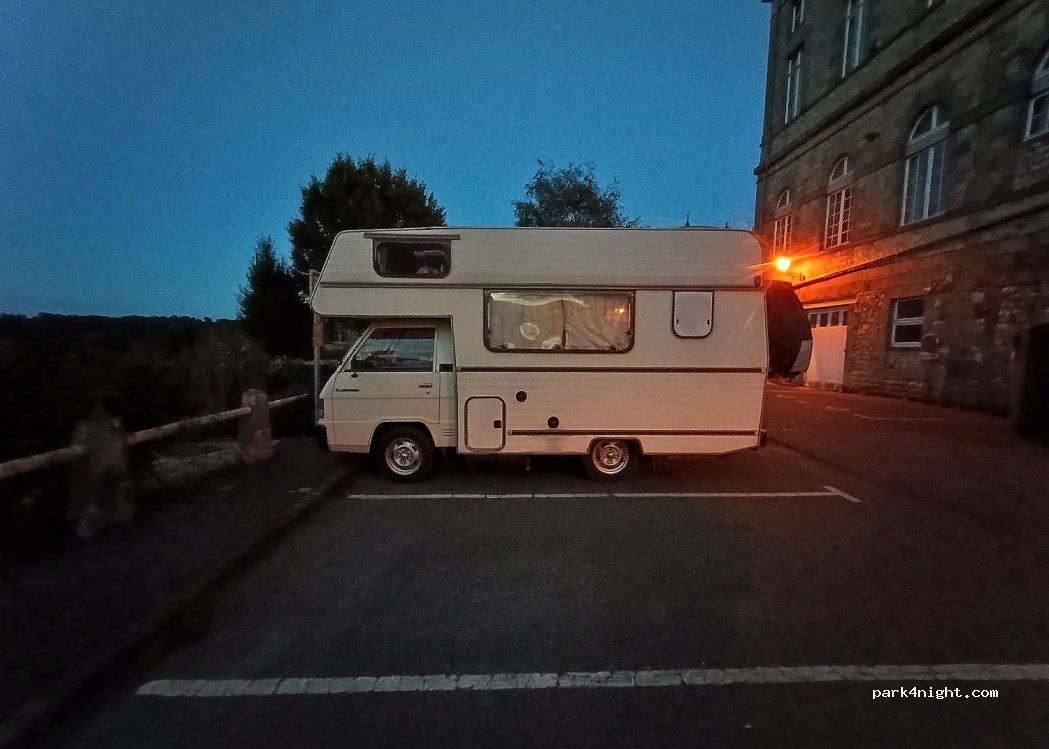 Parking de ville partagé avec les voitures mais peu en soirée. Bien situé pour visiter la cité médiévale et le château. Beau point de vue sur la vallée. De nombreux commerces. Calme. Nuit tranquille.