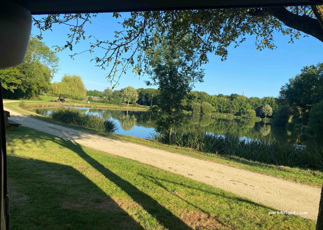 Un endroit très calme au bord d'un plan d'eau avec possibilité de se balader et d'en faire le tour à pied en y croisant hérissons et chevreuil! Il y a plusieurs endroits pour stationner, dont certains à l'ombre sous les arbres. Point d'eau pour jerrican. Il y a des toilettes et un lavabo, le tout d'une propreté irréprochable (nous avons même aperçu ce matin la personne qui fait l'entretien).