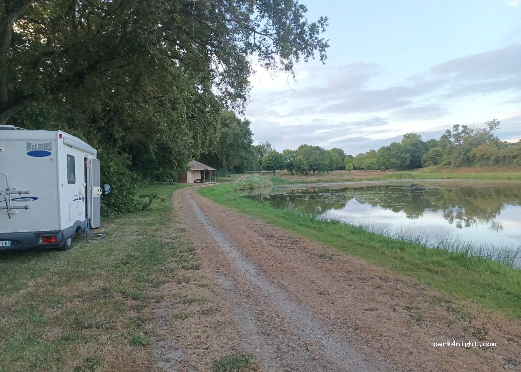 Calme et ombragé, sans limitation de hauteur. toilettes propre et entretenue, point d'eau. table de pique-nique, banc autour de l'étang. un spot au top pour une nuit tranquille.