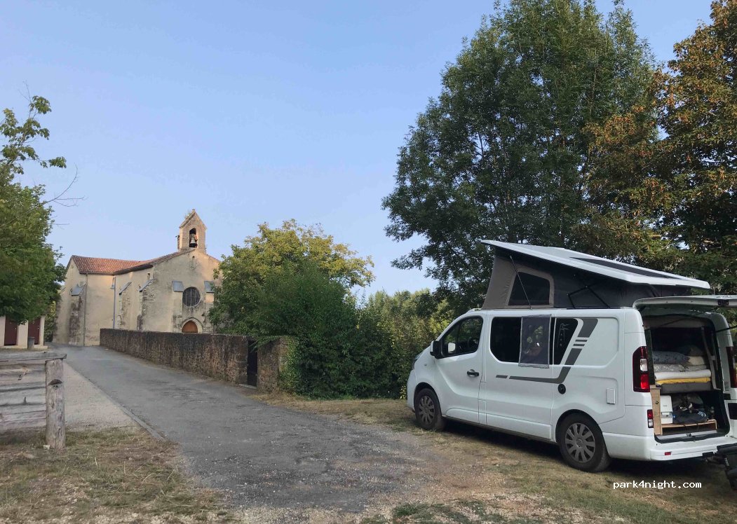 Une place pour 1 ou 2 vans ou fourgons au bout de la petite impasse qui dessert le parking à côté de l’église. Une place à l’ombre d’un tilleul, l’autre au soleil. Terrain plat. L’endroit est très calme.