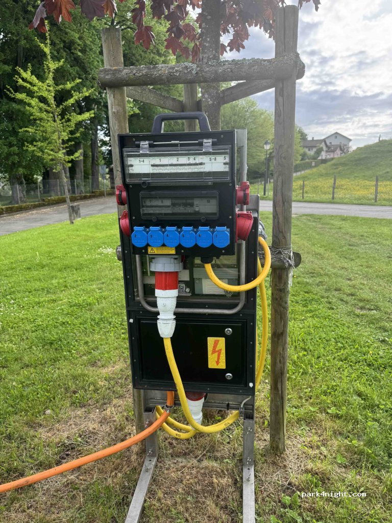 Nice quiet place at the castle. You will need a Swiss adapter for power - no CEE plugs just standard Swiss plugs. If you don’t have Twint you can also pay with cash at the little self service farm stall a few meters towards the farm building with the solar panels on the roof.