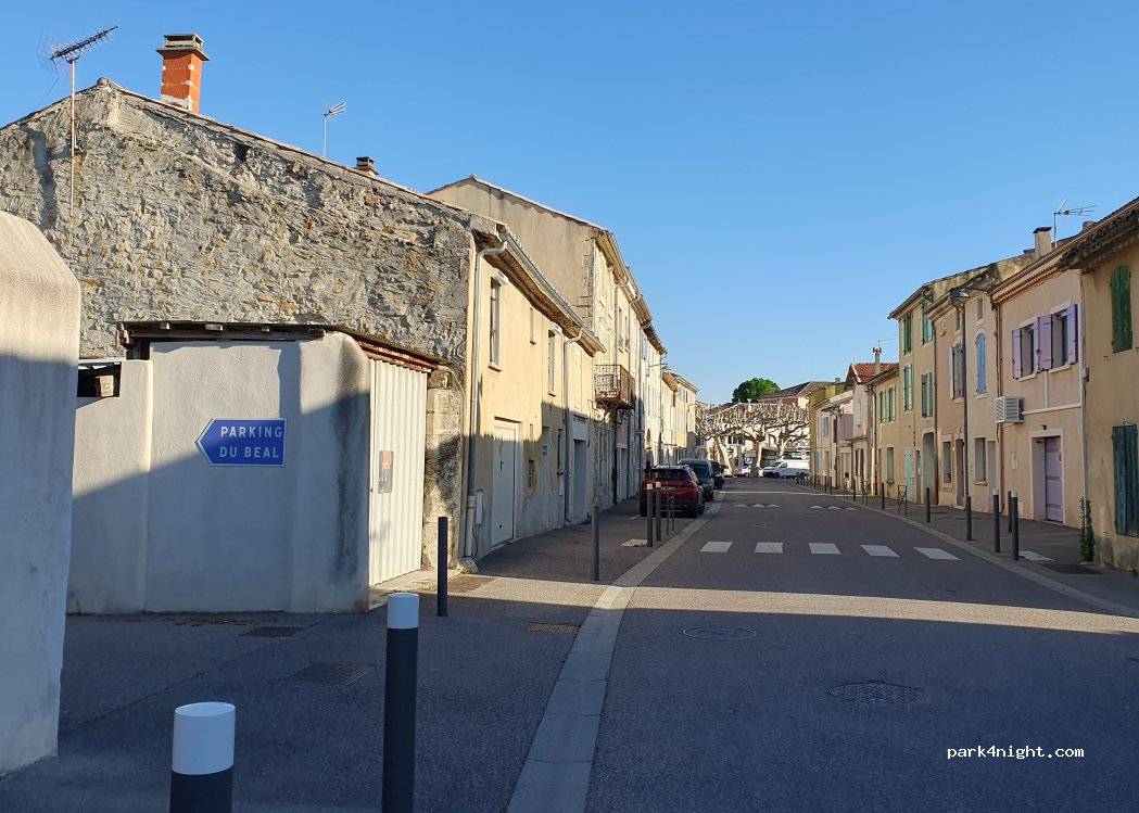Aparcamiento de pueblo, cerca de la nacional 7. Aparcamiento vigilado. Acceso a la autocaravana grande. Cerca del centro del pueblo. A 3 minutos andando de la panadería, tiendas, oficina de correos.