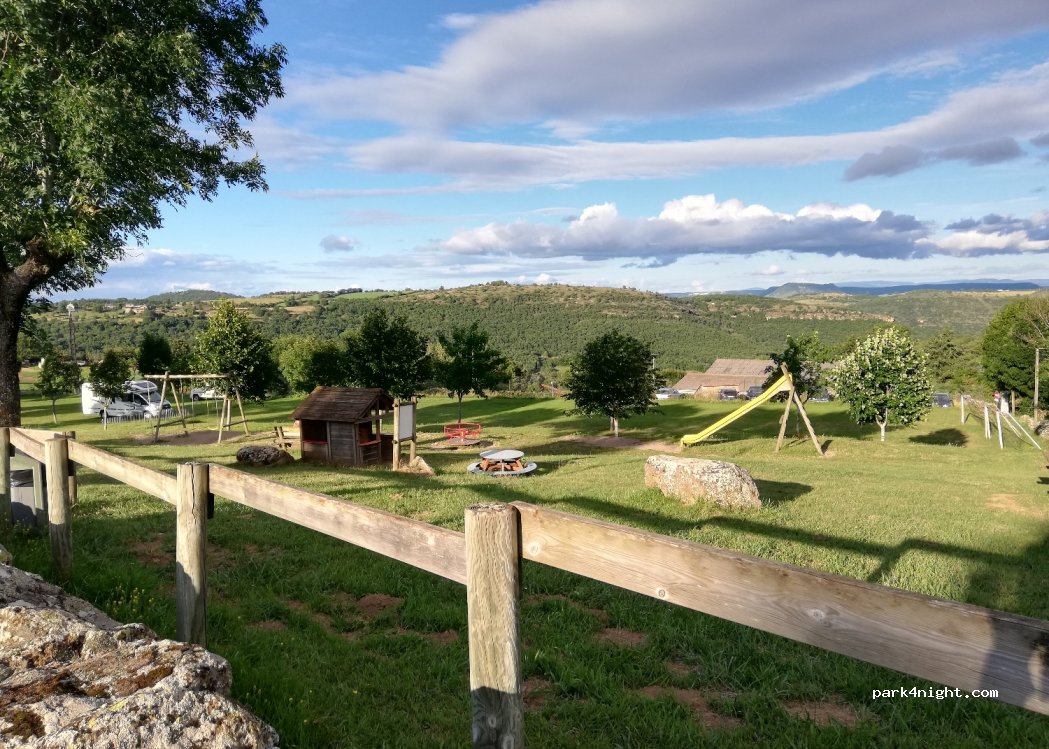 Parking on lawn with a view of the medieval village of Castelnau Pegayrols and its historical monuments. Open only July/August but possibility of parking in the car park below out of season. Playground for children right next door, and start of hikes. Public and free toilets 200m towards the service center. Original drinking water tap fixed in one of the trees next to the road.