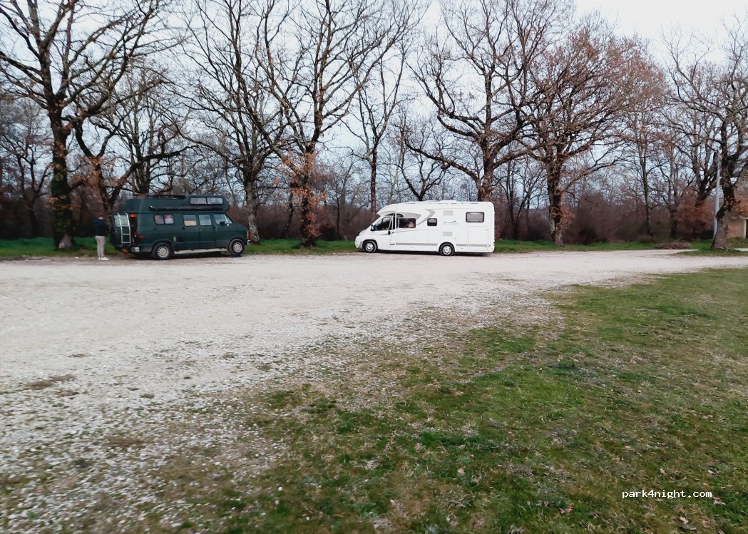 Posto molto tranquillo, in piano, senza servizi, ma in paese ci sono un paio di fontane. Unica cosa sono le ghiande degli alberi che cadono continuamente sul tetto del camper. Il campo da calcio è poco frequentato, almeno in questo periodo.. Da qui potete fare il sentiero nel bosco che porta fino alla piramide e a tutto il bosco magico e alla vista del burrone. davvero suggestivo!