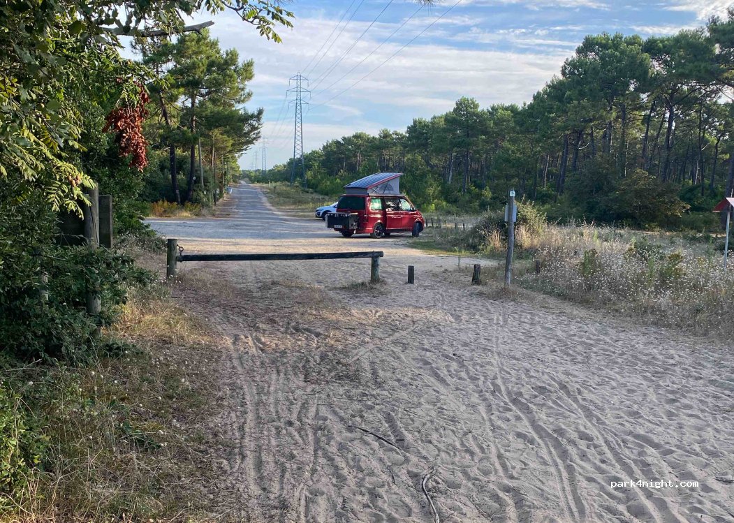 Parking au bout d'une impasse. Pas de hauteur. Très calme. Village de vacances à côté mais évidemment en abondance. Emprunter le chemin entre les propriétés privées pour rejoindre la plage ou à gauche pour entrer dans la forêt.