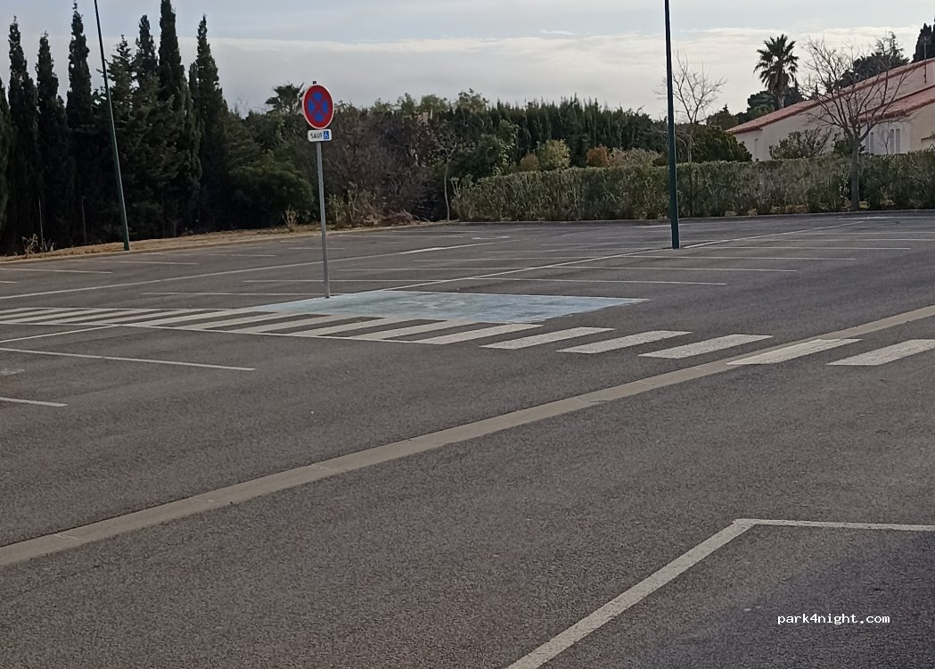 Endroit plat et bitumé face à une salle polyvalente calme ce jour ..un peux plus loin parking ombragé face au cimetière voir avec la mairie pour se stationner un panneau l'indique.