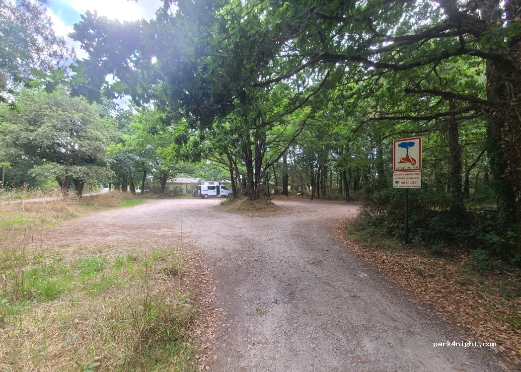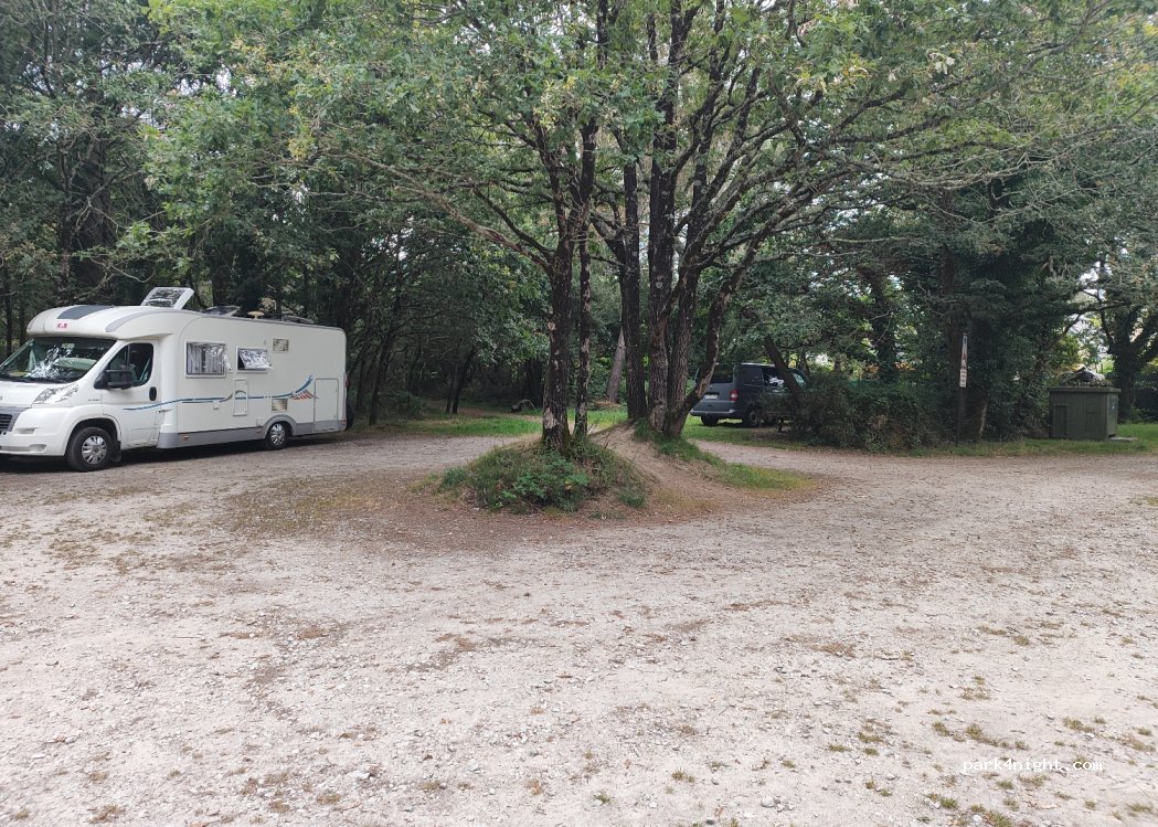 Flat parking in gravel and grass at the beginning of a wood. Close to a small road with very little traffic, feeling of being surrounded by nature. Very very calm. Picnic table, trash can. Departure for hiking in the forest. Very nice place to spend the night and walk around