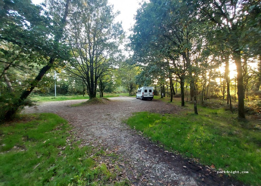Parking plat en gravillons et herbe au début d’un bois. Proche d’une petite route très peu passante, impression d’être en pleine nature. Très très calme. Table de pique nique, poubelle. Départ de randonnées en forêt. Endroit très chouette pour y passer la nuit et se balader aux alentours.