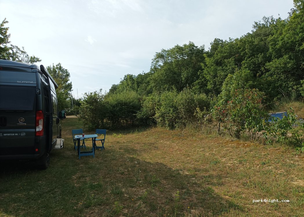 Calme avec une belle vue sur le lac. Accueil sympathique. Eau et sanitaire à disposition . Électricité 8 prises cachées dans les arbres. Pas de vidange eaux grises et noires. Compliqué pour les grands camping car. Merci à l’association.