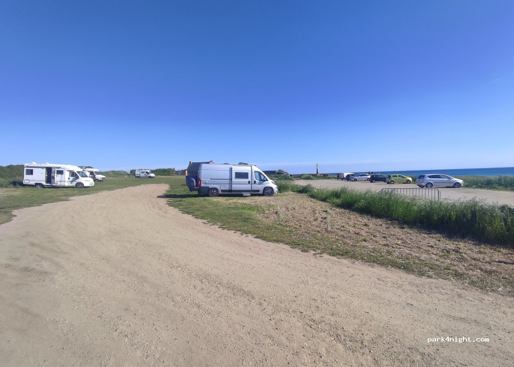 Parking herbeux. Malgré un nombre important de camping car nous avons passé une excellente nuit. Toilettes, poubelles, table de pique nique à disposition. Plage surveillée. Je recommande le spot +++
