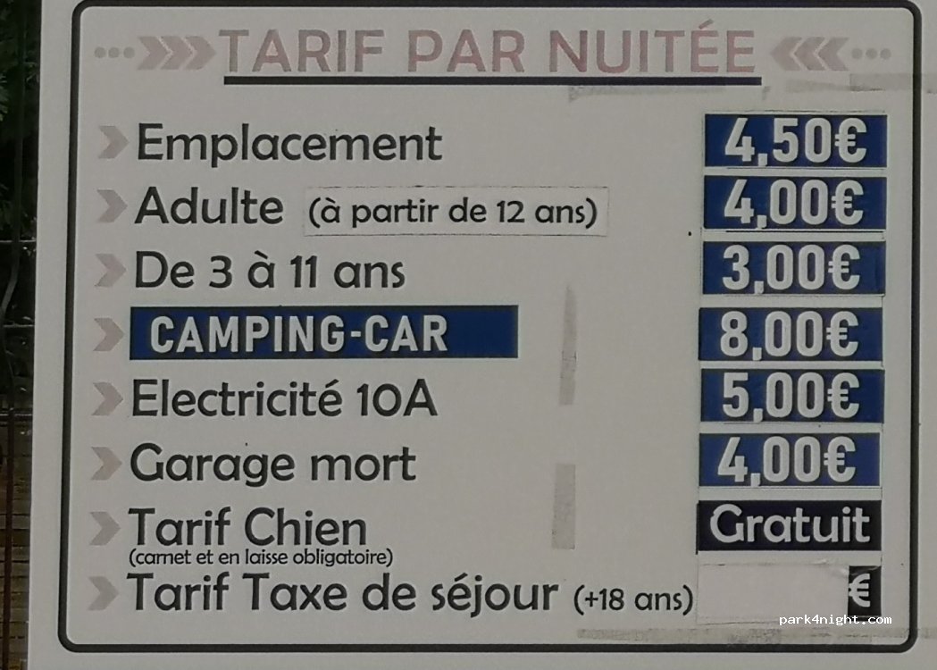 8€ emplacement, 4€ adulte, 0.60€ taxe