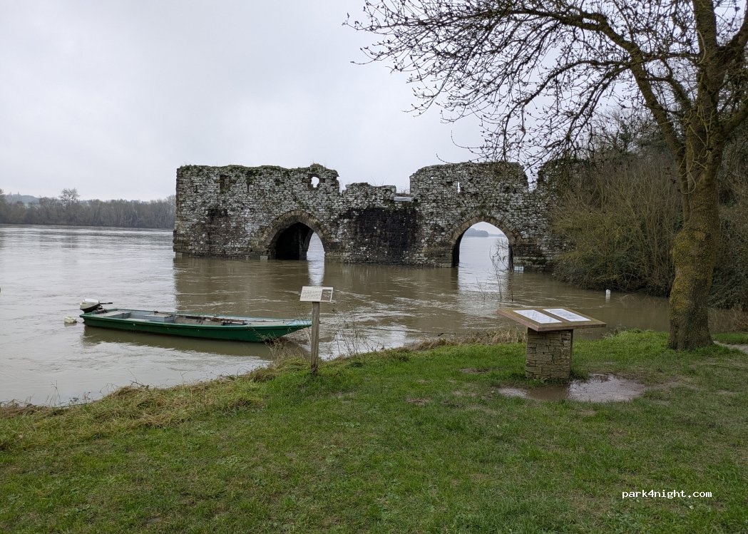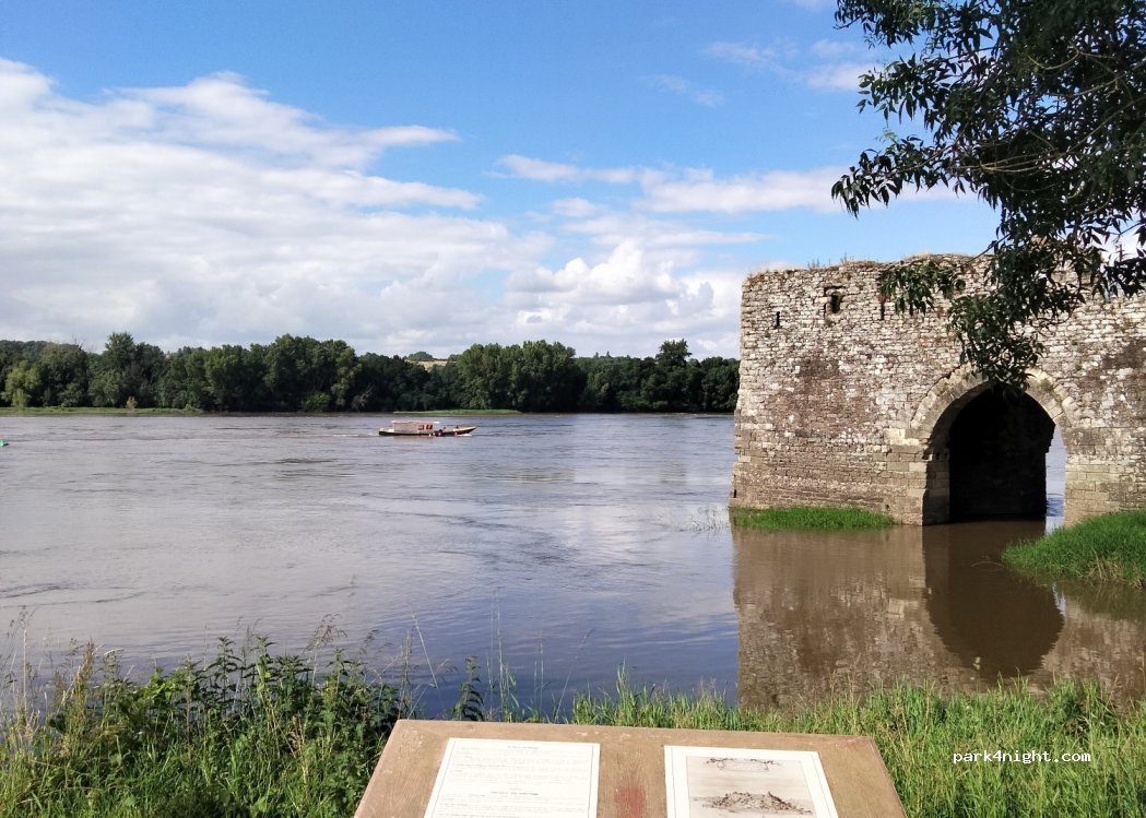 Schöner legaler Übernachtungsplatz mit Blick auf die Loire und die Ruine der Hängemühle. Am Abend des Nationalfeiertages gab es noch ein Livekonzert und ein Feuerwerk. Entsorgen kann man oben im Städtchen auf dem Stellplatz am Schwimmbad.