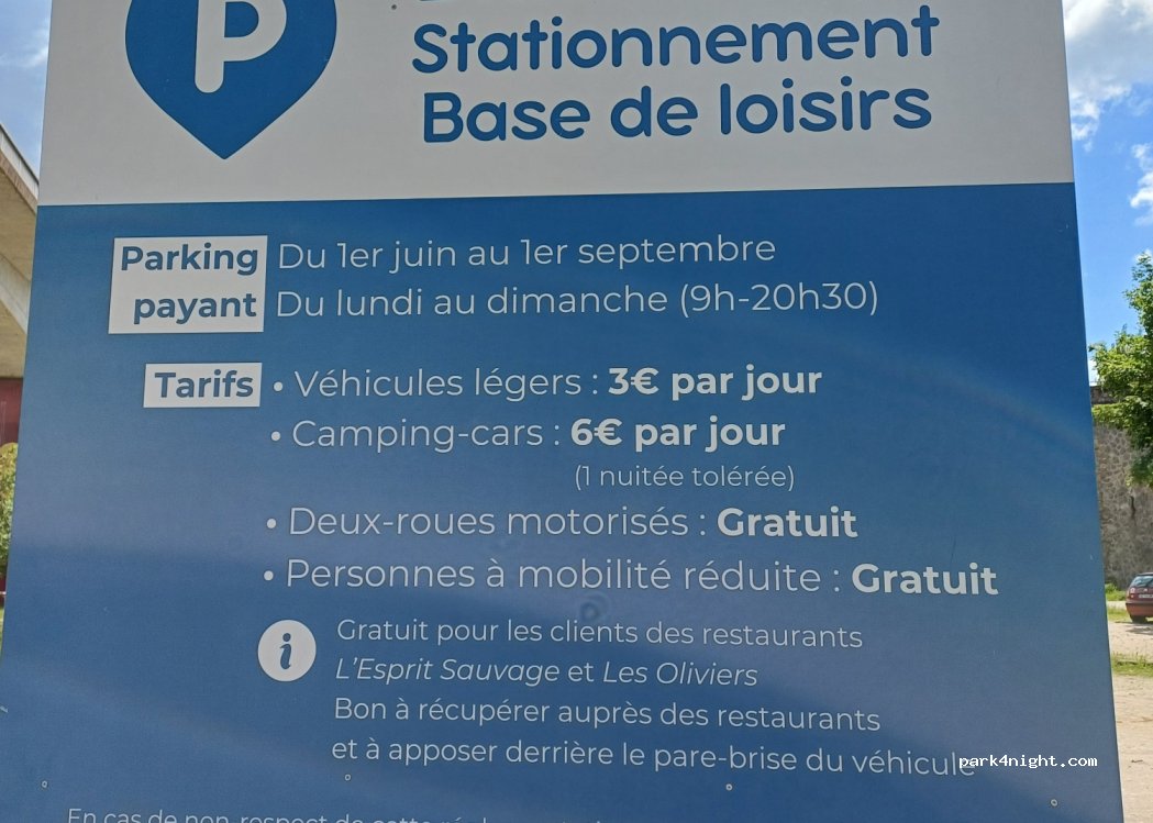 6€ la nuit, très bon emplacement, pas de bruit la nuit, à coté base nautique avec baignade surveille l’été, jeux d’eau (payant) châteaux gonflabe (payant), kart à pedale (payant). Je conseil vivement
