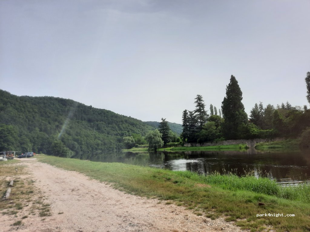 Pas de barrière ce jour (accessible aux cc jusqu’au 1er juin selon les riverains) Parking pratique pour profiter de la base de loisirs et accès par la passerelle directement au bourg médiéval.