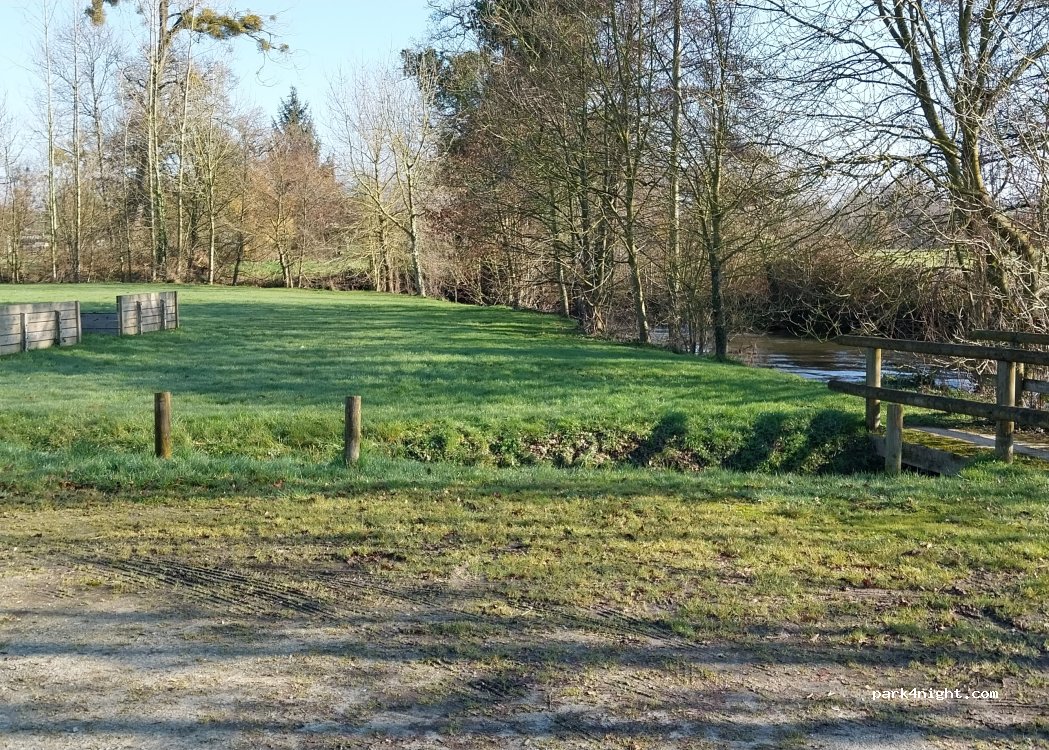 Aire calme au bord d’un étang. Eau et vidange, aire de jeux, aire de sports, tables de pique-nique, dont certaines sous un kiosque, y compris WC et douche.