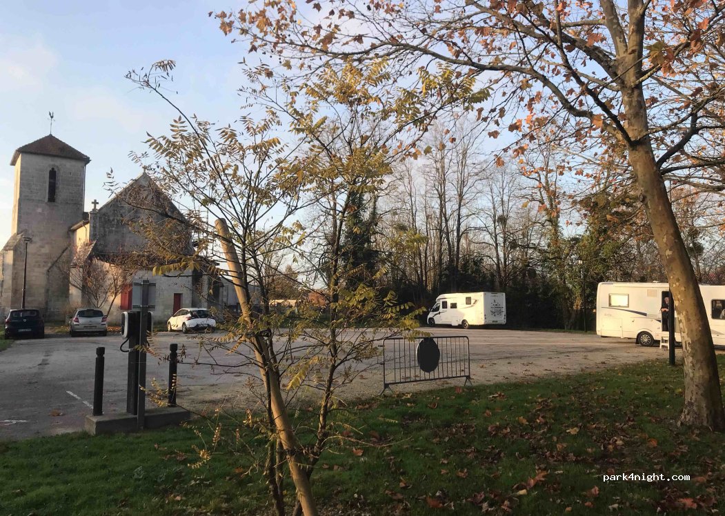 Parking de l'église donc attention si vous avez le sommeil léger. Les lieux sont calmes malgré quelques passages tardifs. Des toilettes sont à proximités, juste à côté de la poste. Balade possible le long de la Charente.