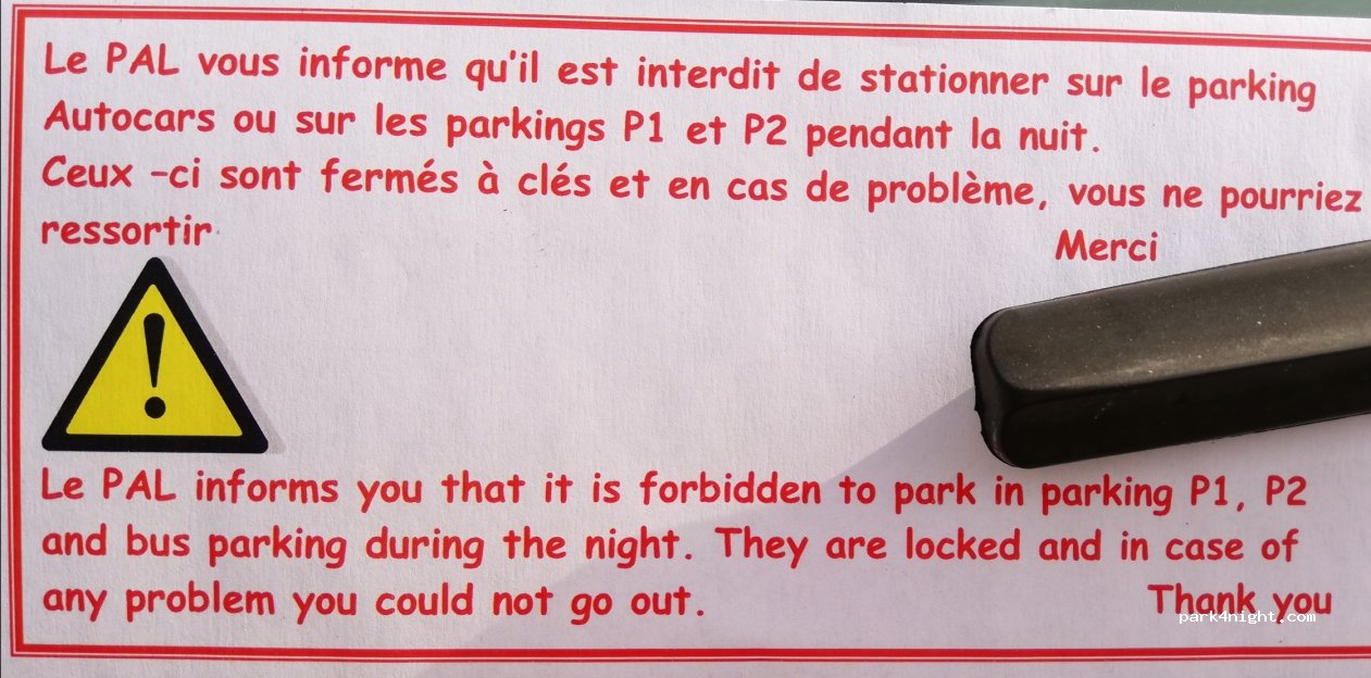 Pour les camping-cars, par mesure de sécurité, il est formellement interdit de stationner la nuit sur les parkings P1 et P2 ainsi que sur celui réservés aux cars et camping-cars. Ces parkings sont fermés le soir par des portails automatiques. Donc il est preferable d'aller sur les parkings P3, P4 ou P5.