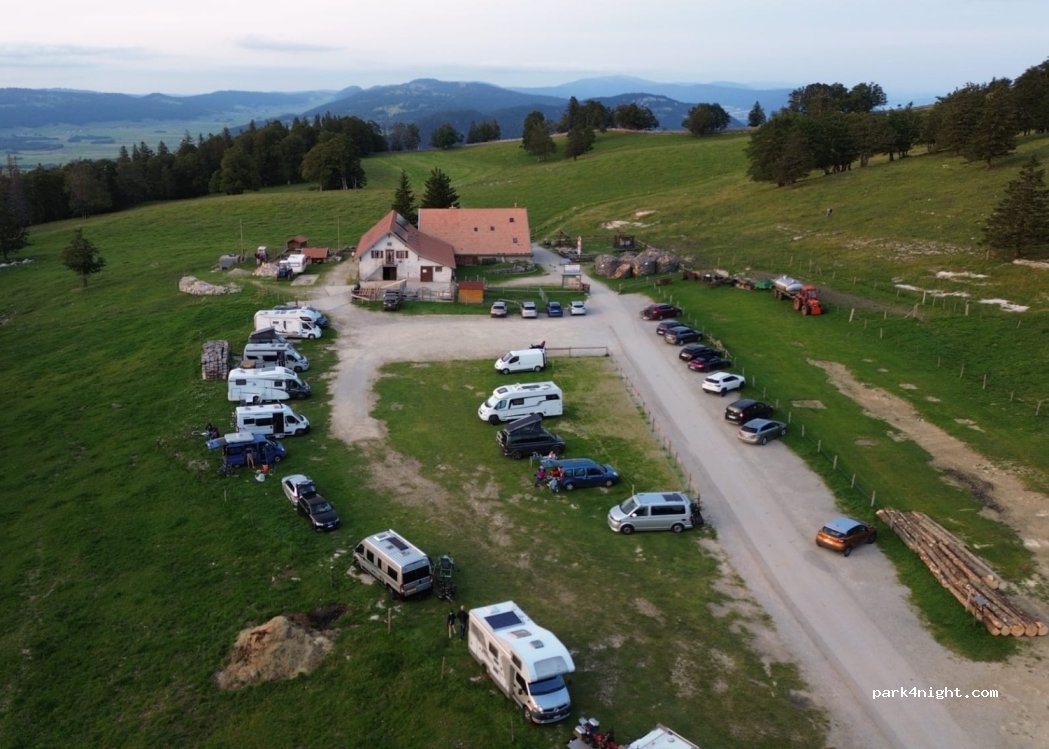 Grosser Parkplatz nur 10 Gehminuten vom Creux du Van entfernt. Es gibt hier sowohl ein Restaurant wo man sich verpflegen kann als auch die Möglichkeit Holz zu kaufen. Feuer sollte jedoch nicht direkt am Boden gemacht werden. Haben ohne Probleme eine Nacht hier verbracht. Während Ferienzeiten wohl relativ beliebt und dann ist man sicher nicht allein.