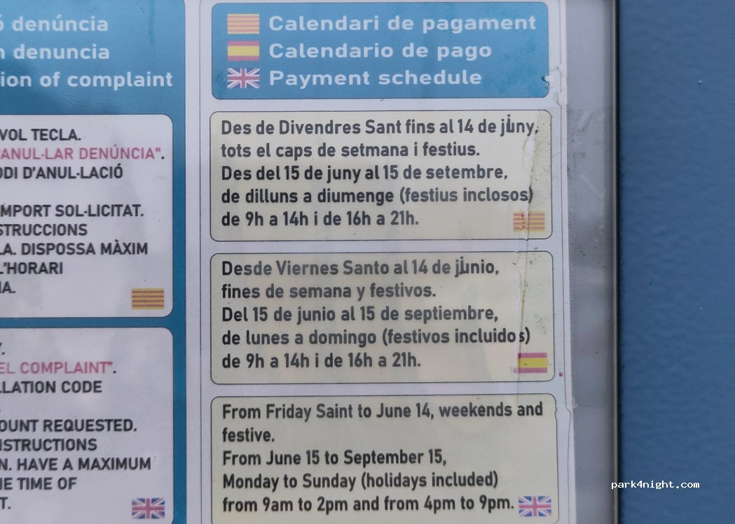 Parcheggio su asfalto a pagamento: dal venerdì santo al 15 di giugno solo weekend è festivi, dal 15 giugno fino a settembre tutti i giorni. Proprio accanto al parcheggio asfaltato ce n’è uno sterrato gratis. Vicino al Mercadona (chiuso domenica e festivi), poco lontano presente Carrefour, Lidl, lavanderia a gettoni e altri negozi.