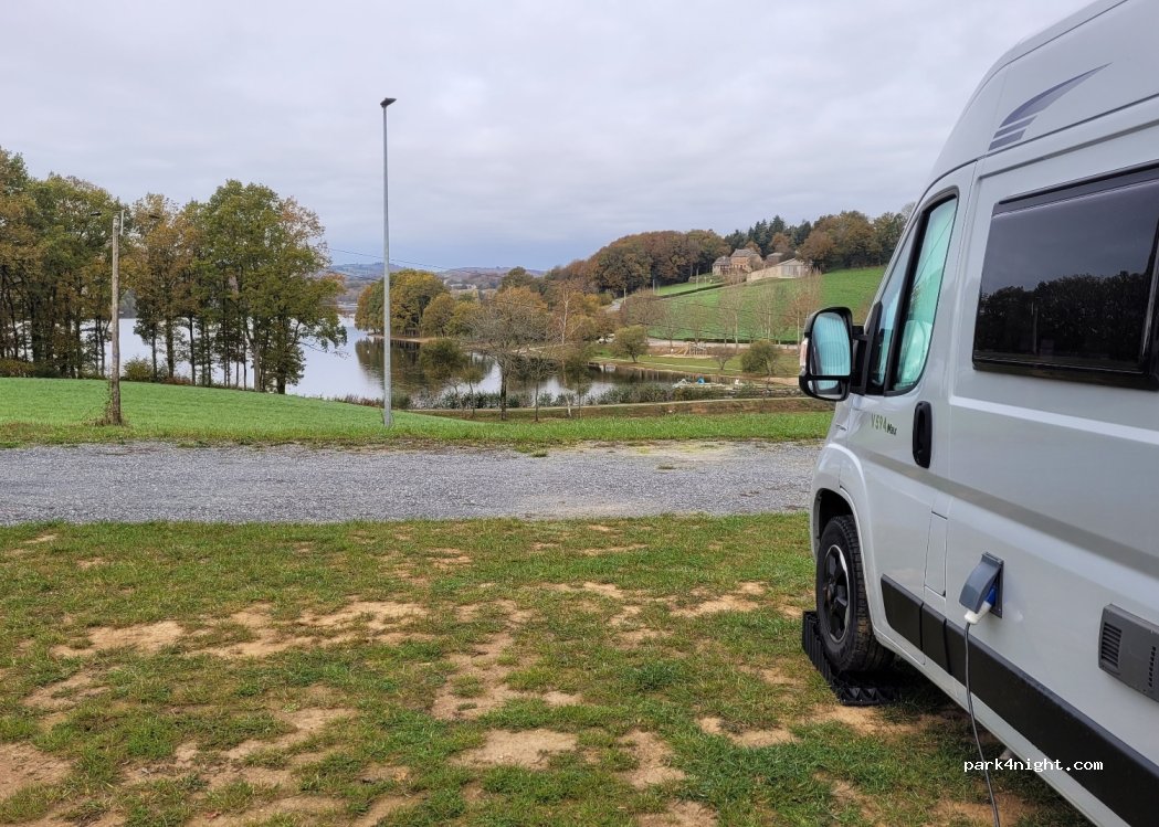 Très belle aire nous y sommes restés 2 jours,eau et électricité pour 10€/jour De belle balade à faire autour du lac Merci à la commune