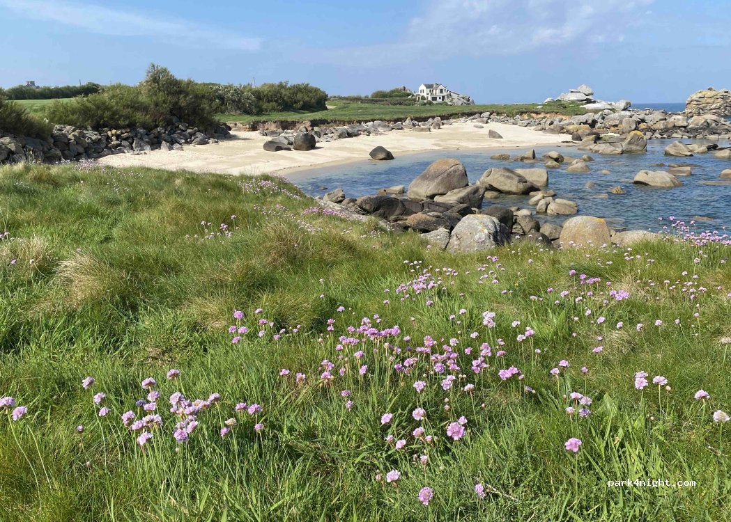 Small parking lot. Lets go to the menhir. slightly sloping. Facing the sea. Directly on the coastal path.