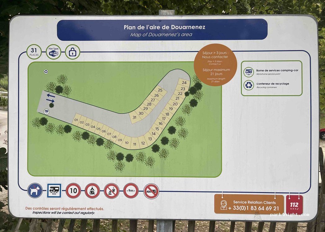 31 places mais pas délimitées..pas d'électricité. assez loin de Douarnenez touristique moins de 2 km port et centre commercial...pour se rattraper ...Déballage non autorisé mais tout le monde ou presque s'en moque même en réservant place très incertaine. Dommage