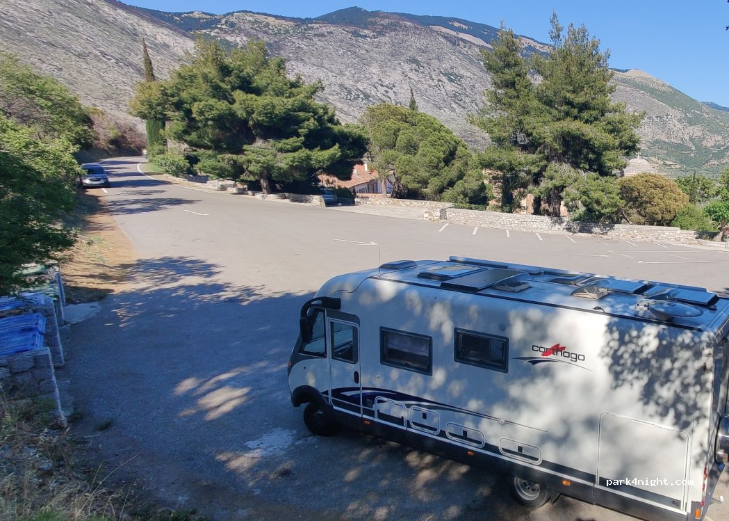 een uiterst stille en rustige plek. men kan recht staan iets aan de zijkant van de parking. vuilniscontainers aanwezig. ongelooflijk uitzicht en bezoek aan het klooster is zeer interessant. 2€ pp