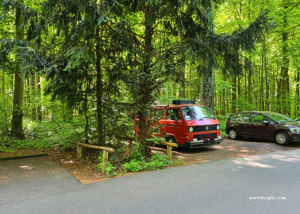 Parking de randonnée très agréable et calme sous les arbres, nombreux visiteurs en journée, très calme la nuit. Arrêt de bus pour les trajets vers le centre-ville, réserve de chasse avec sangliers et cerfs, grande aire de jeux pour enfants, restaurant et stand de frites au marteau tournant