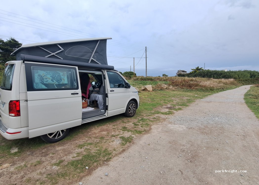 Petit parking agréable avec vue sur mer, mais beaucoup de passages car les gens vont se promener dans le parc naturel qui est juste après le parking (et qui vaut le detour!). Maisons pas trop loin, donc calme à respecter. Pas de commodités.