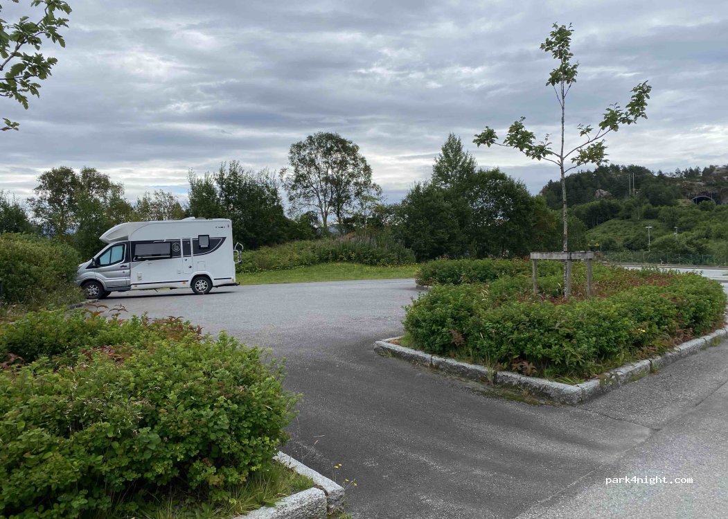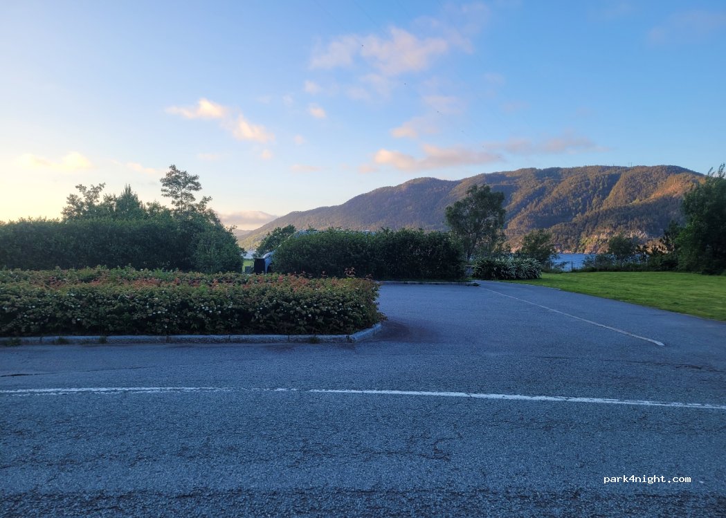 Un endroit pratique pour passer la nuit. Situé le long de l'E39. Belle vue et toilettes publiques propres à 200 mètres à pied du ferry. Table en pierre avec bancs. Et poubelle. Belle plage de galets à 200 mètres. Il y a de la natation dedans. Bien froid. La route est assez calme la nuit. Un peu de bruit de la circulation pendant la journée et le soir.