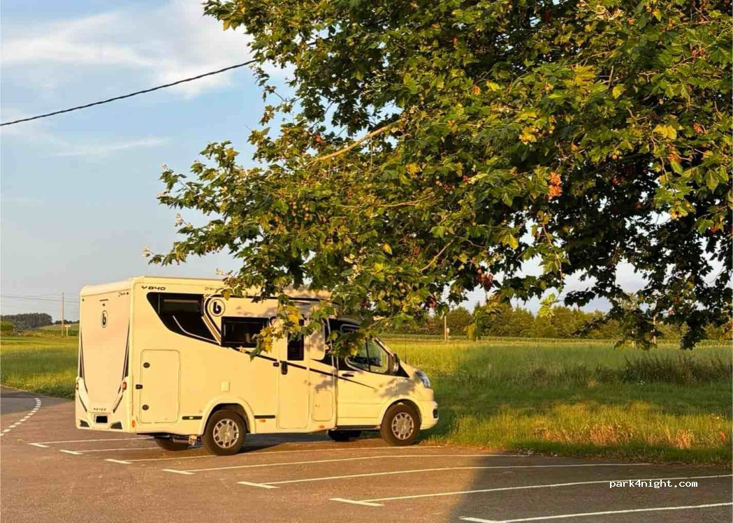 Espace ombragé, plutôt calme (un peu de circulation la nuit sur la nationale un peu plus loin) et sécurisé. Quelques commerces à proximité (pharmacie, restaurant ou café etc… )