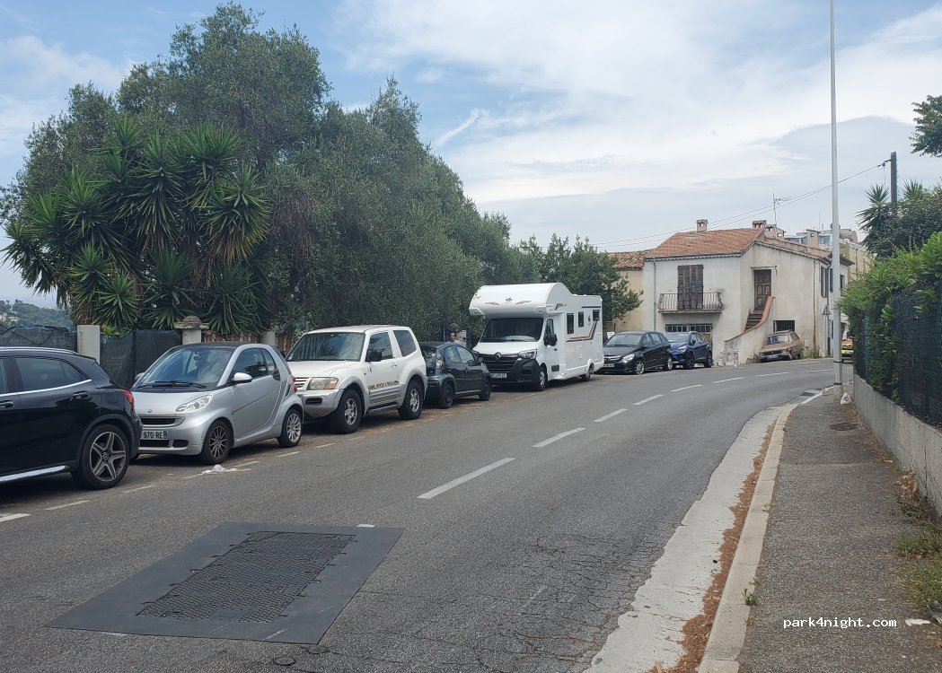 Petit parking en bord de route. Peu fréquentée. Pas de douche ni de toilettes mais une petite belle vue sur Nice. Gratuit