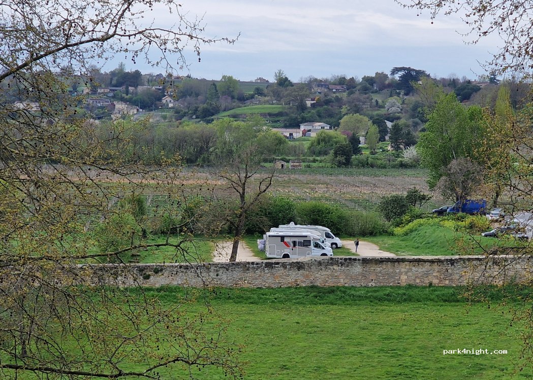 Nice quiet flat parking, alongside a vineyard,a short walk to the river, and into the interesting town of Bourg. Great views of the river from up in the town.