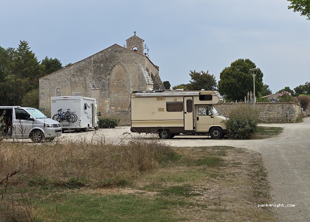 Parking très tranquille au pied d'une église et des jardins familiaux à côté .Attention ne pas se fier a Waze en arrivant de La Rochelle qui vous fait passer par des sens interdits..