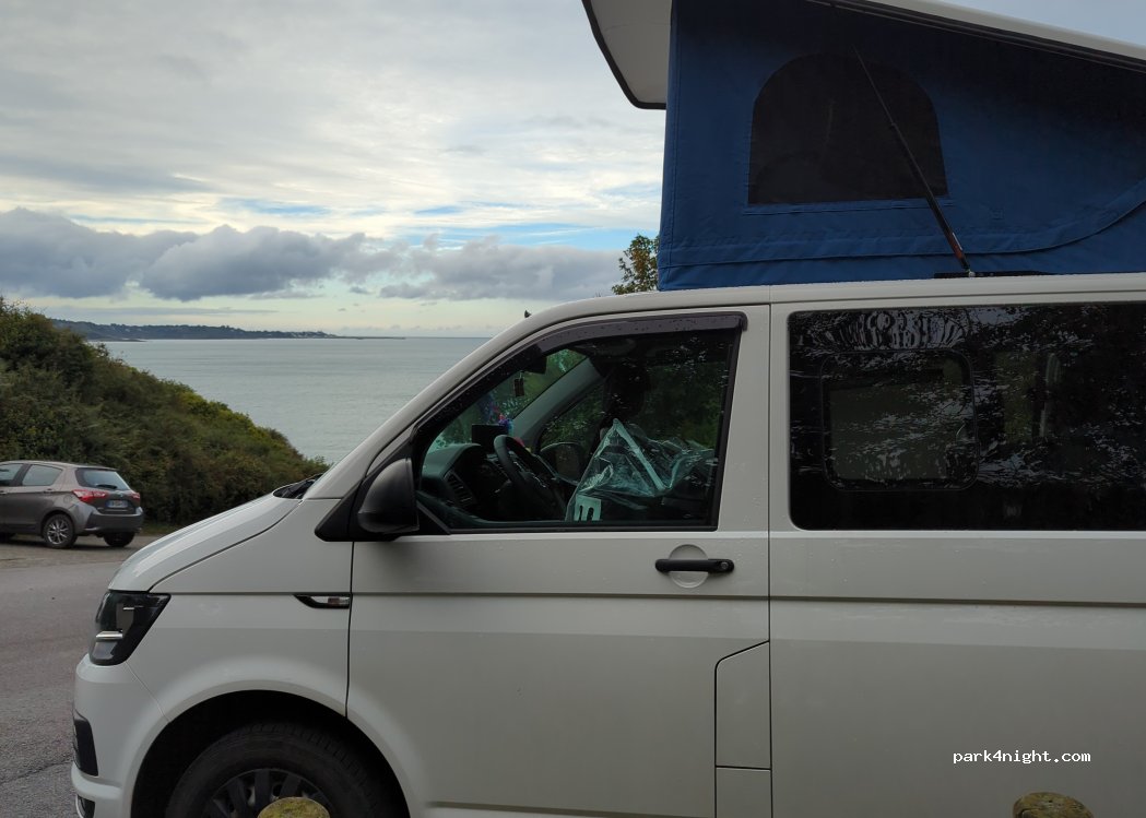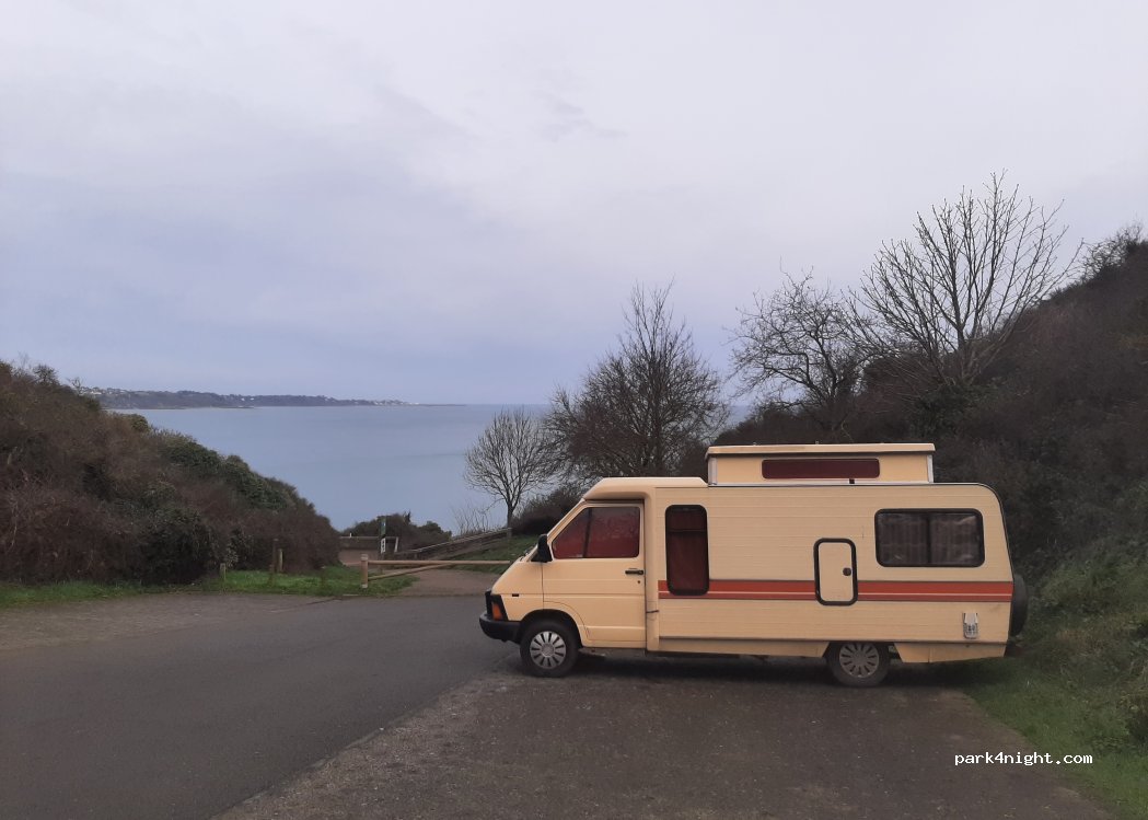 Parking at the beach (cove) of Petit Havre de Pordic. Small road that leads there: for vans and vans. Sloping parking. Nice view of the sea from the parking lot. Pretty cove downstairs.