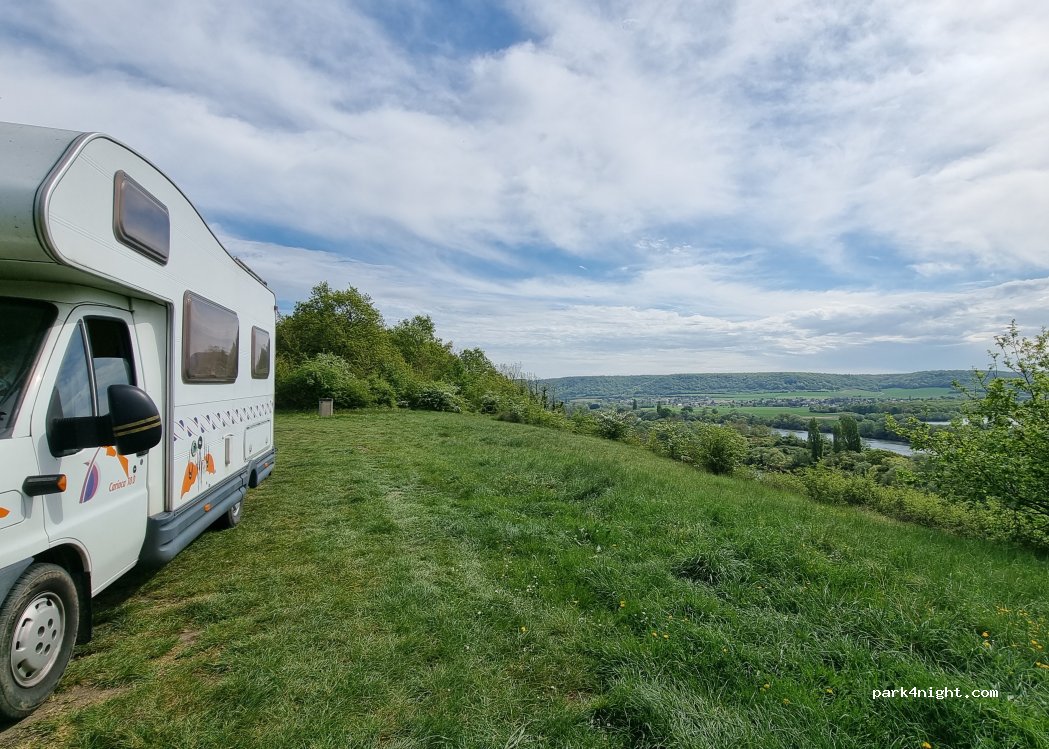 Hoch über der Seine direkt an einer Landstraße. Schöner Blick. Um 16 Uhr standen schon 4 Wohnmobile dort - mehr als zwei sollten dort nicht über Nacht parken, sonst wird es bald verboten.