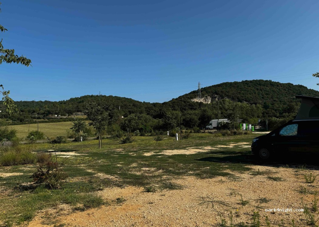 Très belle aire très calme. Pas beaucoup d'ombre , il faut laisser le temps aux arbres de pousser, mais il y a de l'air. De très belles randonnées de l'autre côté de Montclus.