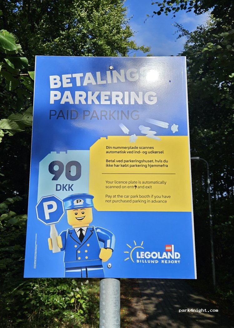 Estamos en legoland, en un primer momento fuimos al parking num. 3, que es donde pone que pueden entrar autocaravana, al salir de legoland sobre las 19.30, nos vimos el coche de seguridad del parque, me preguntamos si podíamos quedarnos esa noche en el, y nos comenta que es imposible, nos comenta que tenemos que quedarnos o en el camping o un poquito más lejos, en el parking nun. 6 que es gratis.
