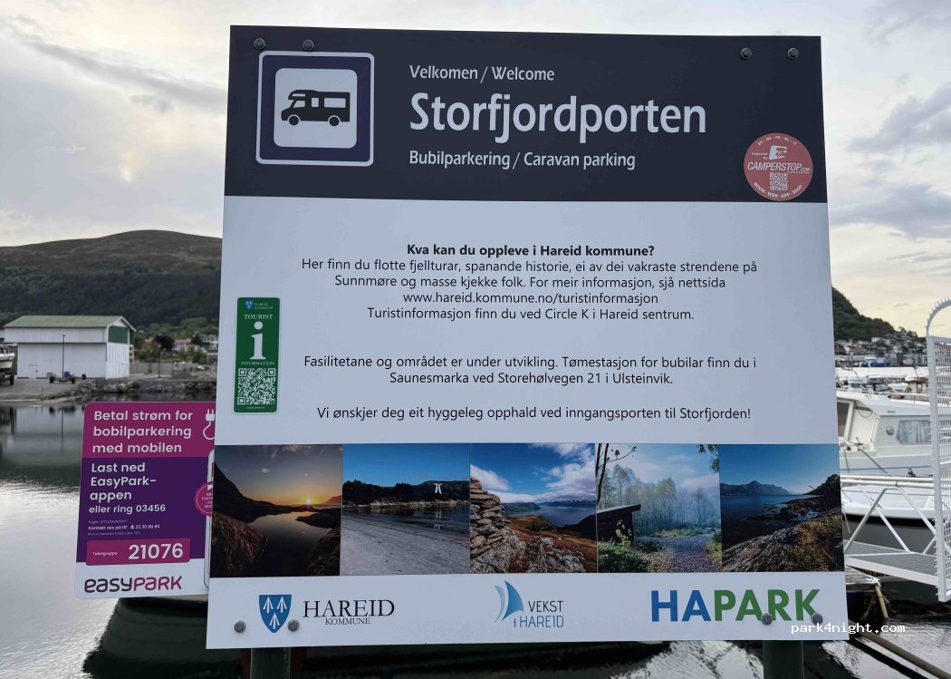 Kostenloser Wohnmobil Stellplatz. Man schaut über den Bootshafen zur Fähre oder zum Fjord. Im Hintergrund sind Berge. Kreuzfahrtschiffe von und nach Geiranger fahren auch vorbei. Stromsäulen funktionieren, sind aber NICHT in der Easy Park APP zu finden. Ruhig in der Nacht. Man kann direkt am Wasser in die Stadt spazieren.