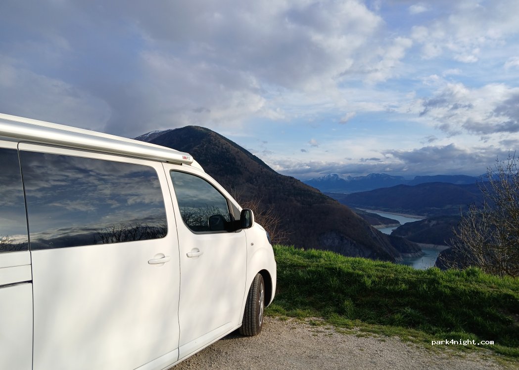 Vue imprenable sur le lac de Monteynard... Toilettes sèches à disposition mais très hygiénique. Table de pic nic et banc à 10m du parking. Facile d'accès, peut accueillir environ 4 CC. Un des meilleurs spot jamais fait... Nous reviendrons.