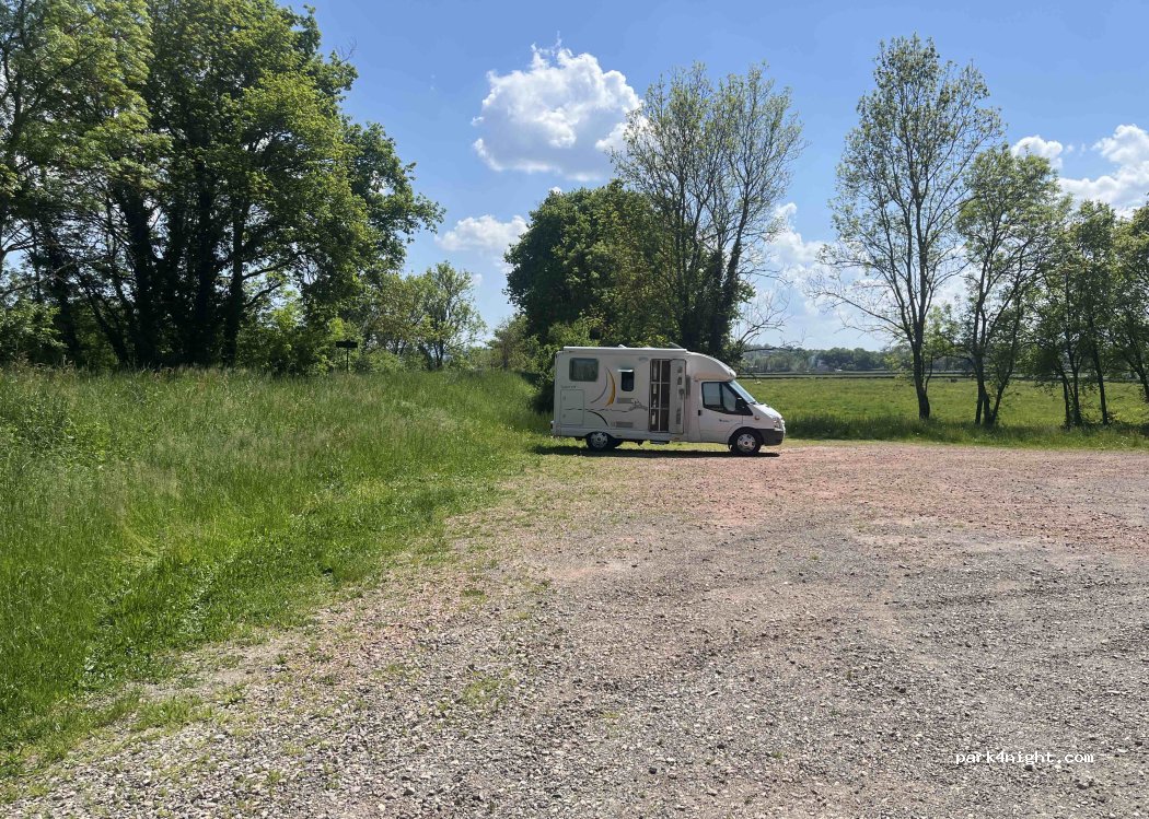 Area parcheggio del verde, molto tranquillo, abbiamo passato una notte perfetta senza problemi. Vicino al paese a due minuti a piedi, piste ciclabili adiacenti e un fiume vicino con persone che pescano. Il castello e il suo parco valgono assolutamente una sosta e il piccolo paese nonché borgo offrono i servizi essenziali siamo stati molto soddisfatti della scelta.