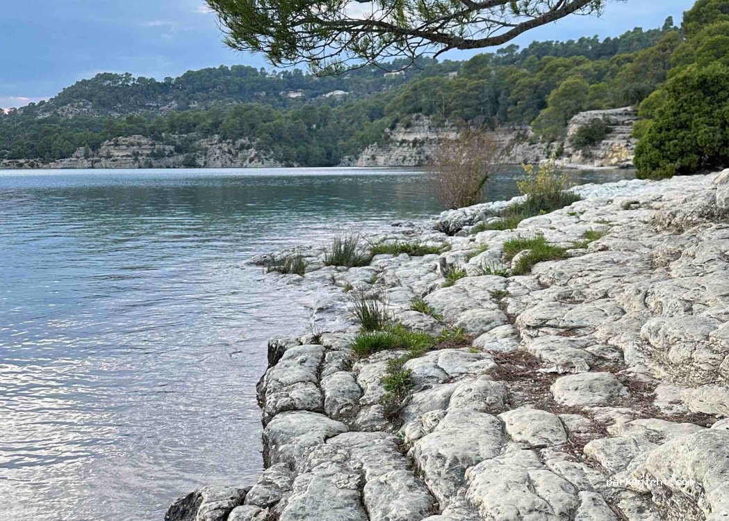 Parkeren bij het meer van Esparron de Verdon, directe toegang te voet tot het meer, betaald parkeren, zie foto. Prachtig uitzicht op het meer. grote schaduwrijke parkeerplaats voor busje, camper, geen slagboom, toilet in de buurt, waterfietsverhuur, kajak mogelijk.