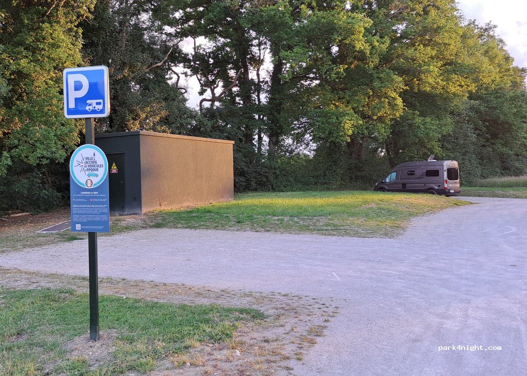 Parking neuf ,aménagé voitures et 4 places réservées pour camping car .A proximité de l'autre côté du canal tables de pique-nique, recharges pour vélos électriques. Aussi un bar et épicerie.
