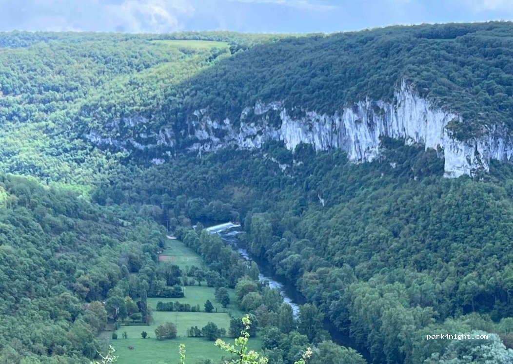 No services, but 4G available. I could find a flat spot after moving around a bit. Nice views 10 meters through the bushes, but not much to see at the parking area.